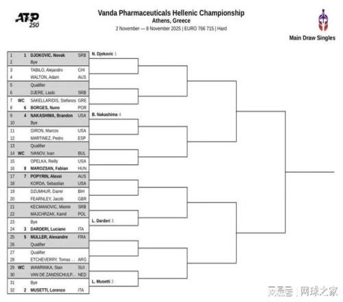 穆塞蒂的雅典征程注定不易。他作為二號種子,首輪輪空,但此后可能接連面對斯坦·瓦林卡或范德尚舒普等強手;四分之一決賽可能對陣揚-倫納德·施特魯夫或亞歷山大·穆勒;半決賽的潛在對手則是安德烈·達爾德里或塞巴斯蒂安·科達;最嚴峻的挑戰(zhàn)可能來自決賽,對手很可能是頭號種子德約科維奇。